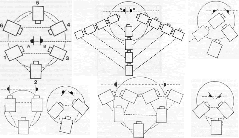当两人面对面谈话的时候,或者说,在交流的时候,他们的视线也相交,这条相交的视线就称作LINE OF INTEREST,或称 LINE OF FORCE。格里菲斯发现,如果在这条线的一侧拍一个镜头,比如说,A 处于画面的左侧,B 处于画面的右侧。然后再到这条线的另一侧去拍一个镜头,那么在银幕上,A 就会处于画面的右侧,